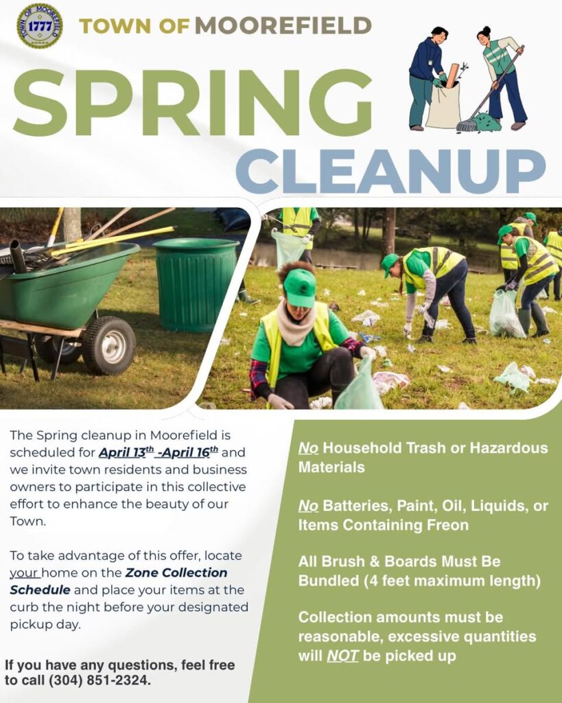 The Town of Moorefieldโs Annual ๐๐ฉ๐ซ๐ข๐ง๐ ๐๐ฅ๐๐๐ง๐ฎ๐ฉ will take place ๐๐ฉ๐ซ๐ข๐ฅ ๐๐โ๐๐, ๐๐๐๐. This is your chance to freshen up your property and help keep our community clean and beautiful!