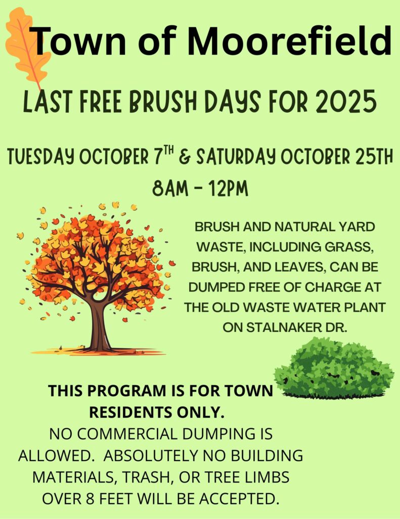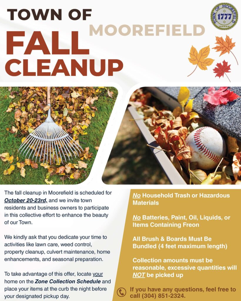 The Town of Moorefield is pleased to announce the annual Fall Cleanup, scheduled for October 20–23, 2025. This is a great opportunity for residents and business owners to beautify their properties and prepare for the winter season.