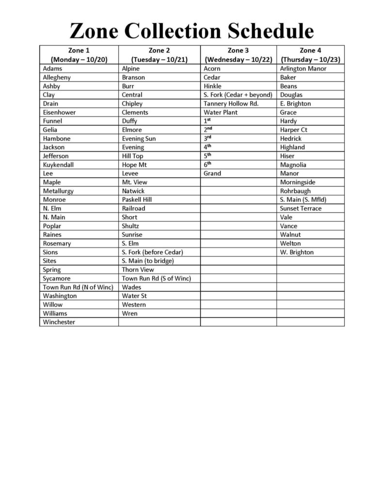 Residents are encouraged to focus on lawn care, weed control, property cleanup, culvert maintenance, and seasonal enhancements. Please place items at the curb the night before your designated pickup day according to the Zone Collection Schedule [see Zone chart below].